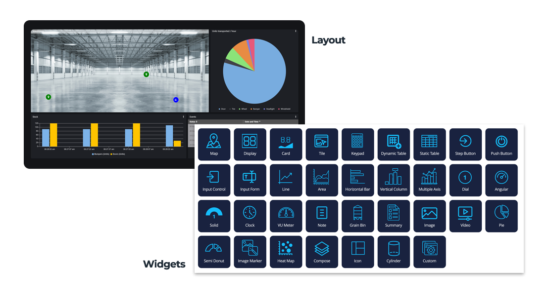 Consisting of Widgets that can display and collect user data. IClab provides a variety of widgets to handle your real-time data. Available options range from simple dials to tables, maps, videos and multiple IoT objects.